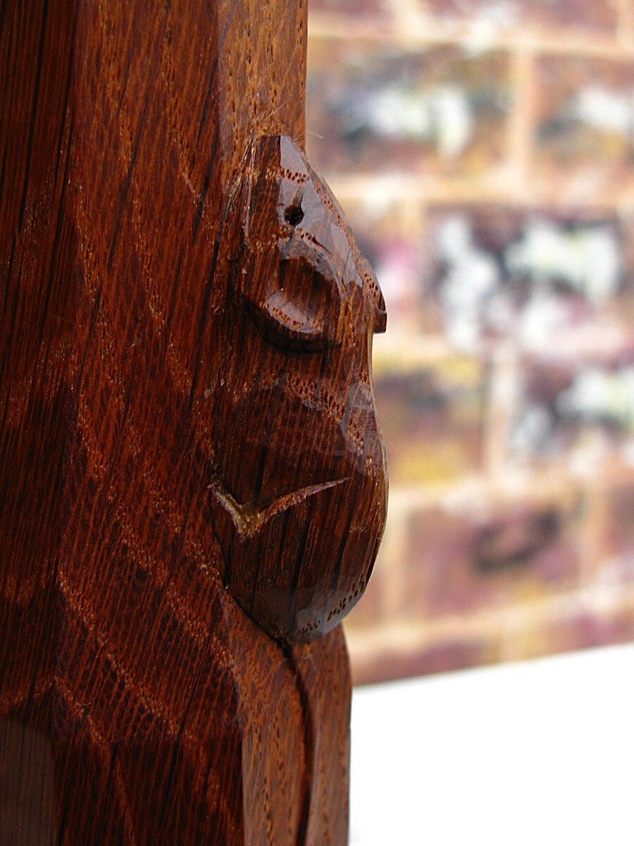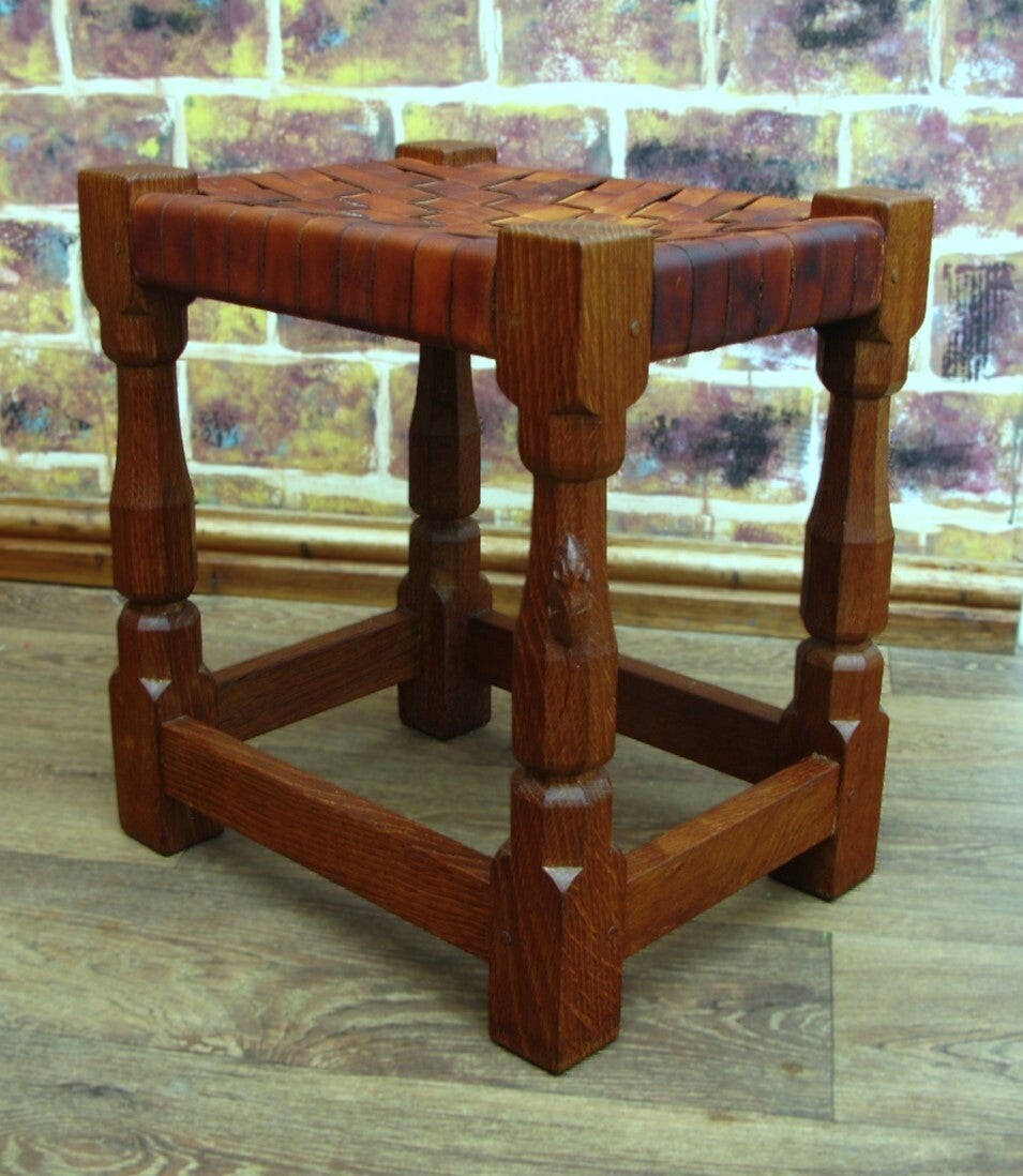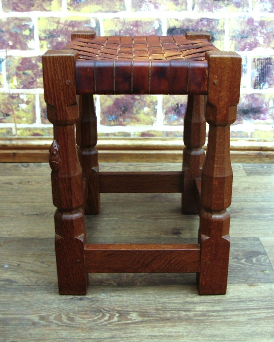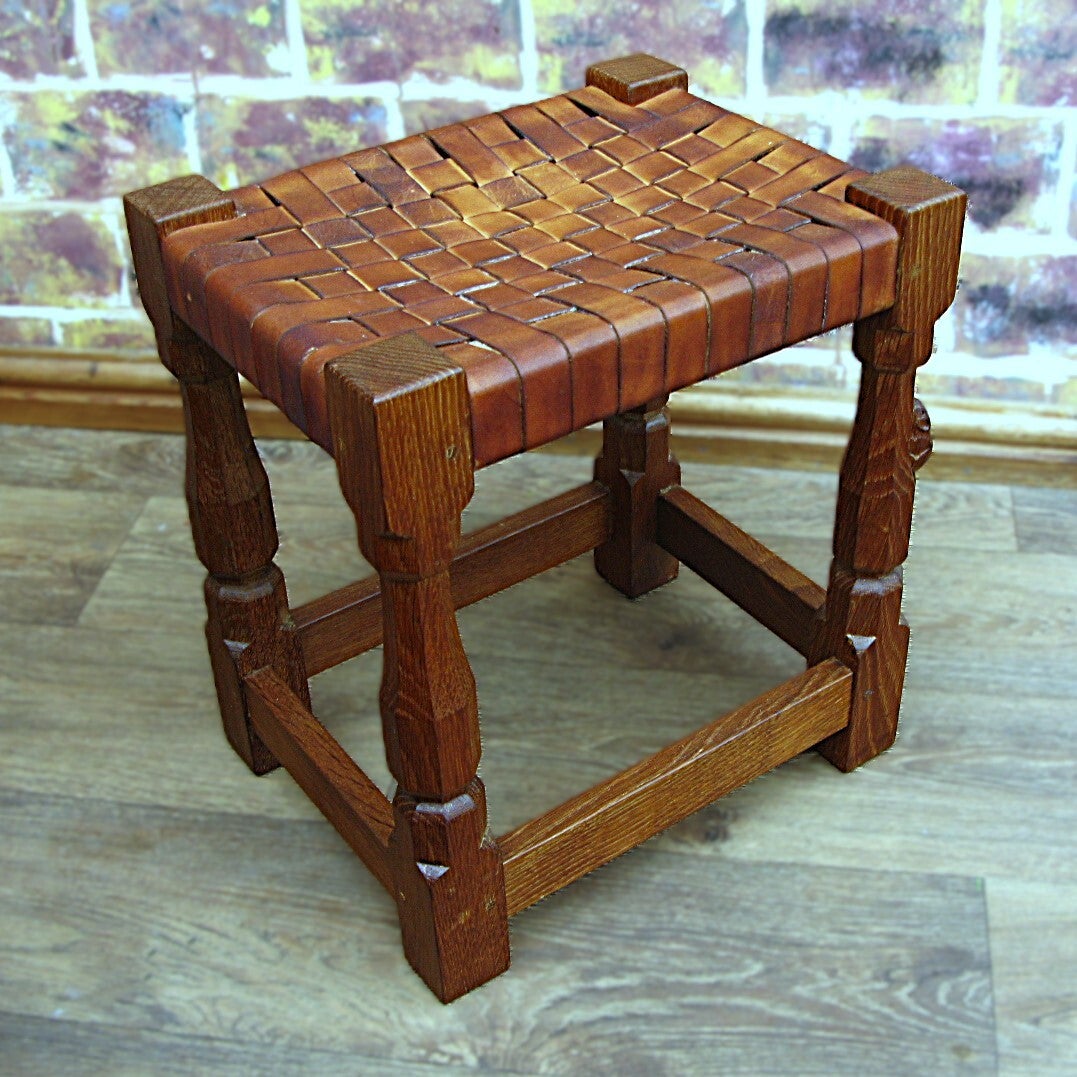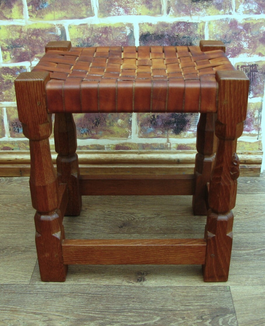 EARLY ROBERT "MOUSEMAN" THOMPSON OAK STOOL WITH LATTICE LEATHER SEAT - c.1940s