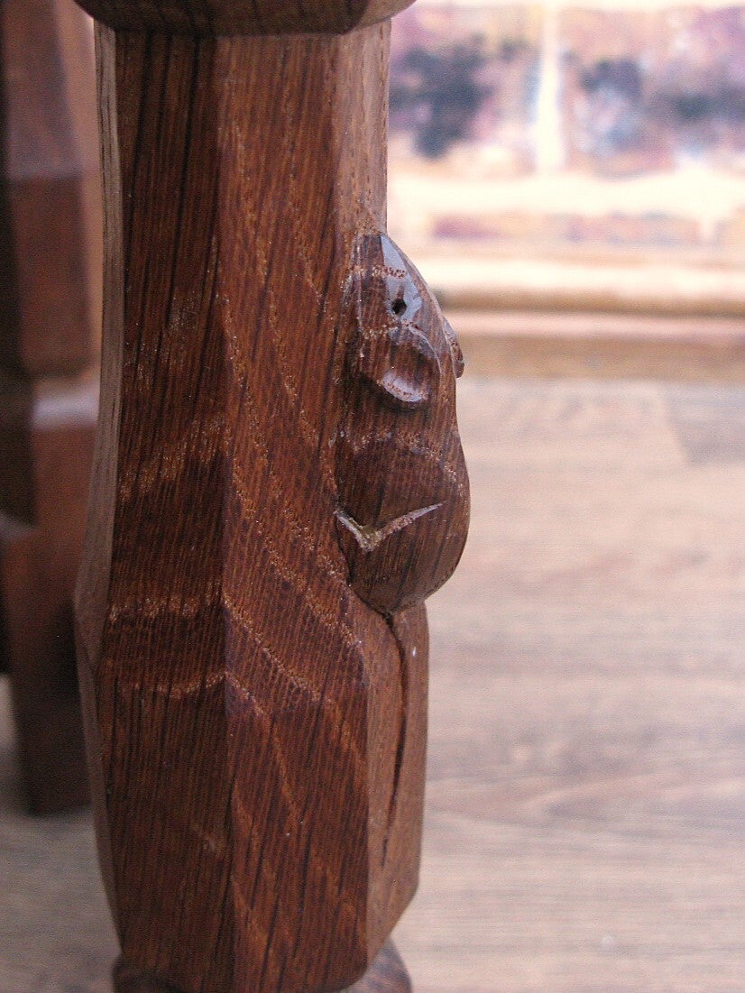 A 1940s or 1950s early Robert "Mouseman" Thompson Yorkshire oak joint stool with a leather latticework seat on chamfered octagonal supports, block feet and carved with a mouse signature.
