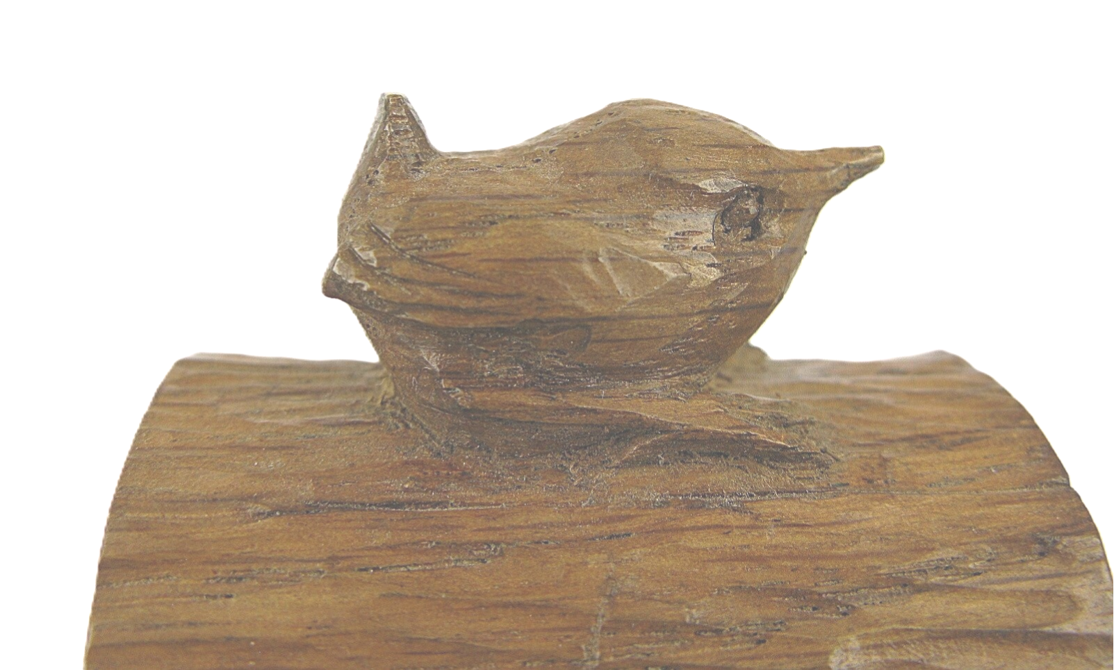 Typical of Bob Hunter's work, the finely carved signature wren is nice and plump and sharply observed. Even the underneath of the log is fully hand tooled and adzed. Such is the attention to detail and craftsmanship, that, to prevent the napkin ring from rolling over, Hunter has carved a pair of stumps to each log to balance them safely on the dining table.