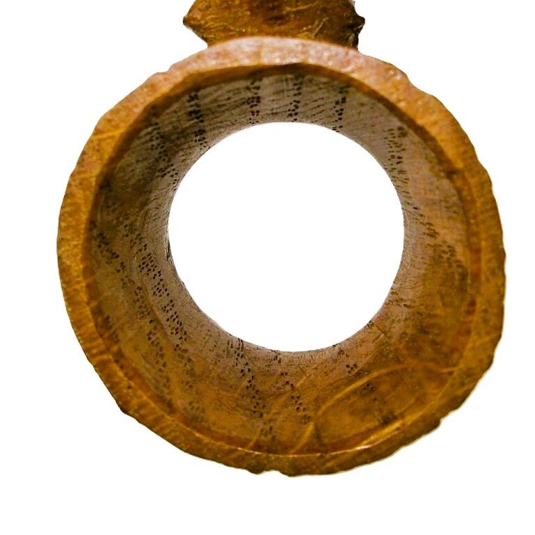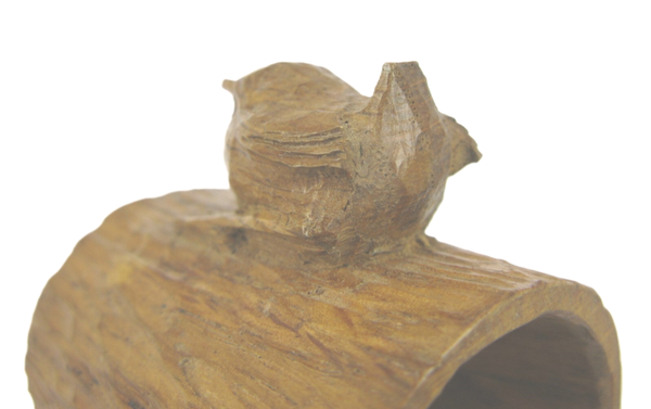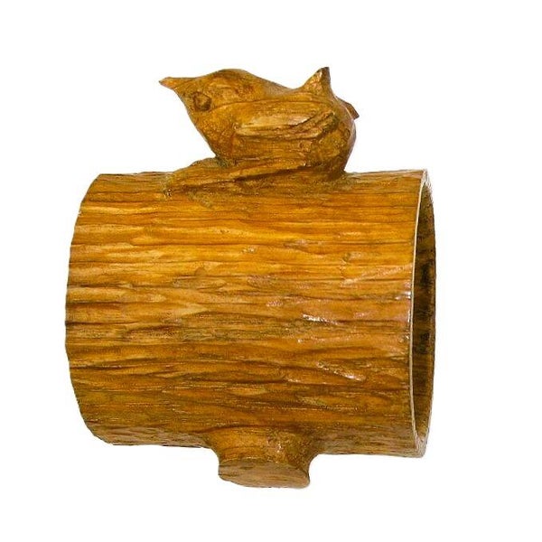 This napkin ring is skillfully carved in the shape of a hollow log and features Hunter's signature wren perched on the top. A highly detailed piece, achieved by fully hand-tooling and adzing throughout, even under the log.