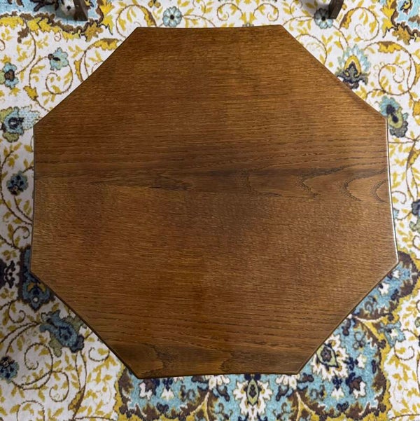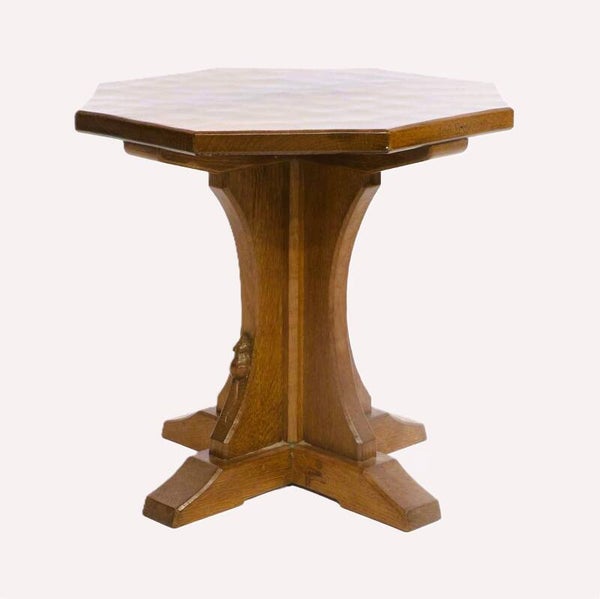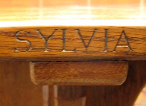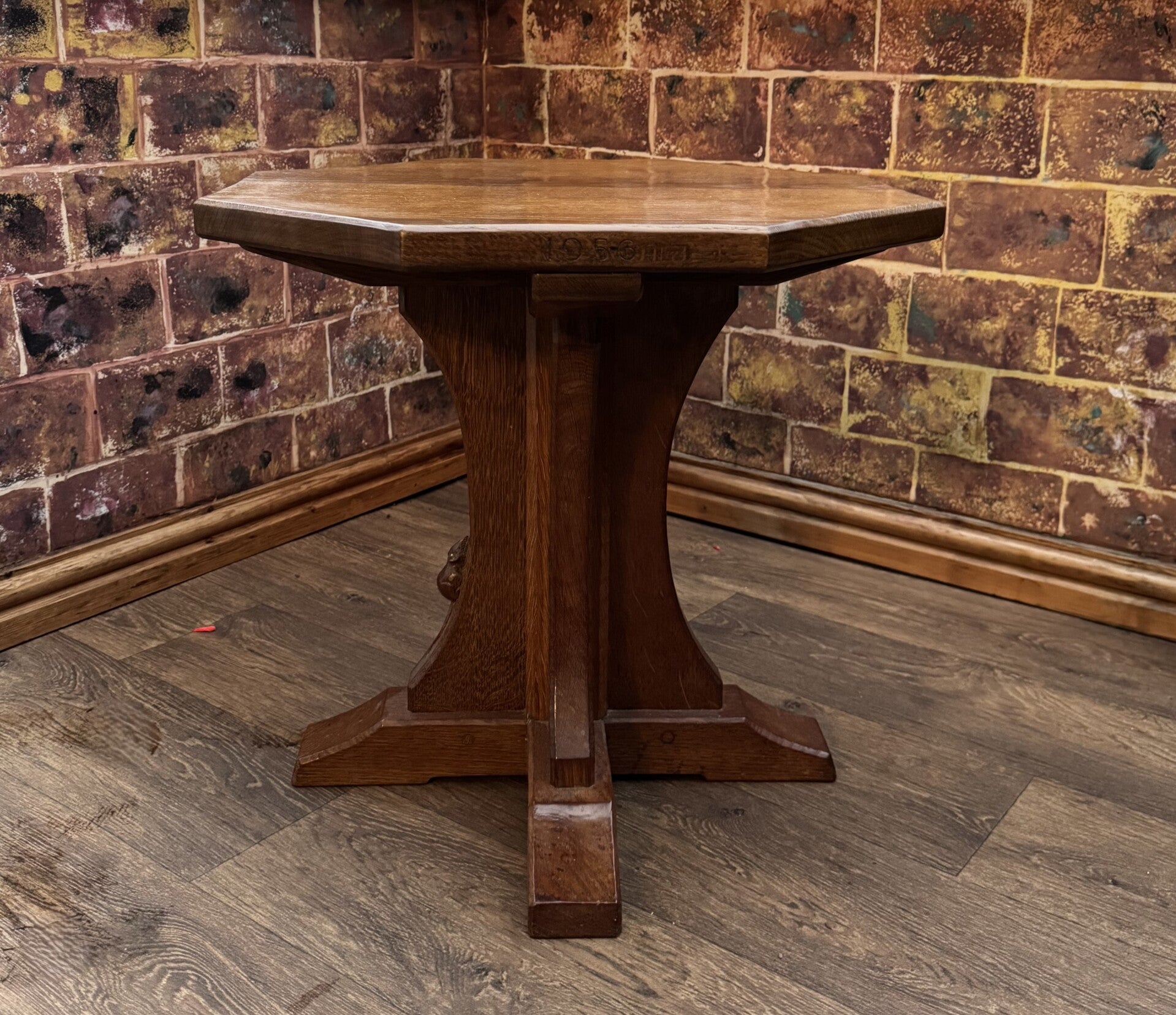 It is a 1956 Robert "Mouseman" Thompson Yorkshire oak two plank octagonal coffee table, the adzed top carved to one edge "Sylvia" and another edge "1956." The table top is pegged onto a cruciform base, adzed all over, not just the tabletop. One of the legs is carved with the trademark mouse signature.