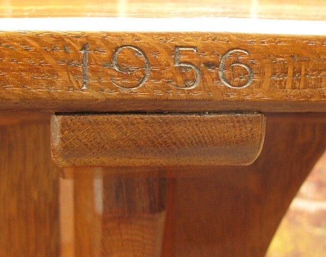 This coffee table, inscribed on two of the leading edges of the top with "Sylvia" and the date "1956," was made specially for his fiance in the year before their marriage. It is something special, made out of hours by a life-long "Mouseman" craftsman, who learned his skills directly from Robert Thompson himself. The table stayed in the family until I acquired it from Ken's estate. I like to use the phrase "the best of the best" when describing my stock, and with its quality and undisputed provenance, with its charming back story, this coffee table is exactly that.