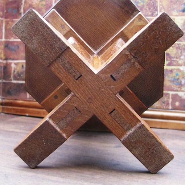 It was made by Ken Almack (1932 - 2021) one of Robert Thompson's craftsmen, and younger brother of Mouseman craftsman, Colin (Beaverman) Almack (1930 - 1996). At the age of fourteen Ken began his apprenticeship under Robert Thompson, then, in the early 1950s. he was "called up" for National Service in the Green Howards. After National Service, Ken returned to Kilburn as a craftsman, where he remained in employment with "Mouseman" for the rest of his working life. In 1957, Ken married his fiance, Sylvia, at St Mary's Church, Thirsk with Bob (wrenman) Hunter as his best man.