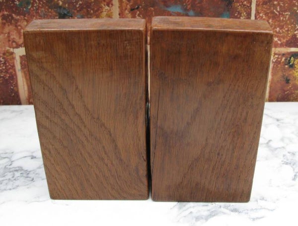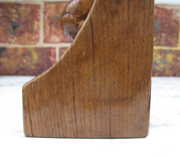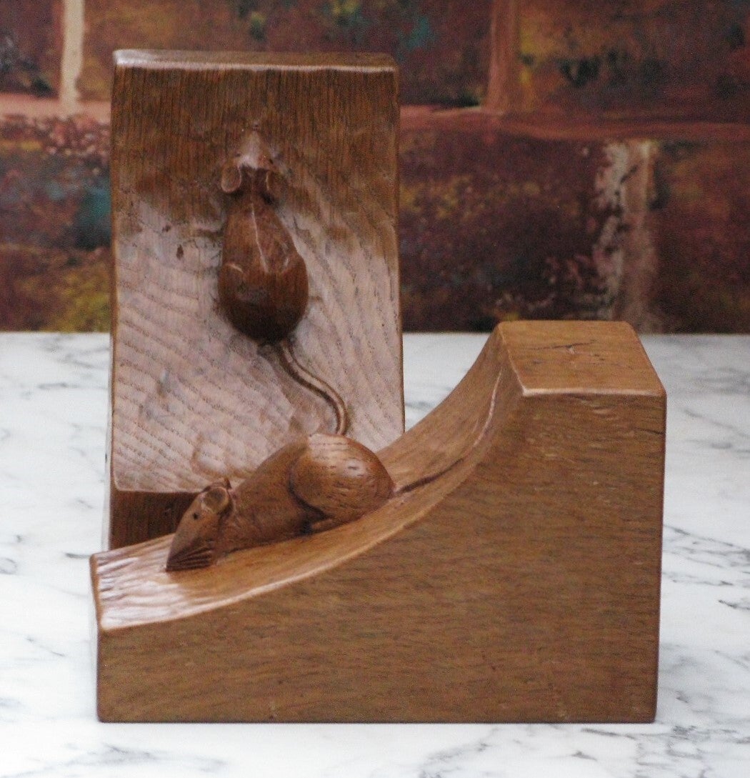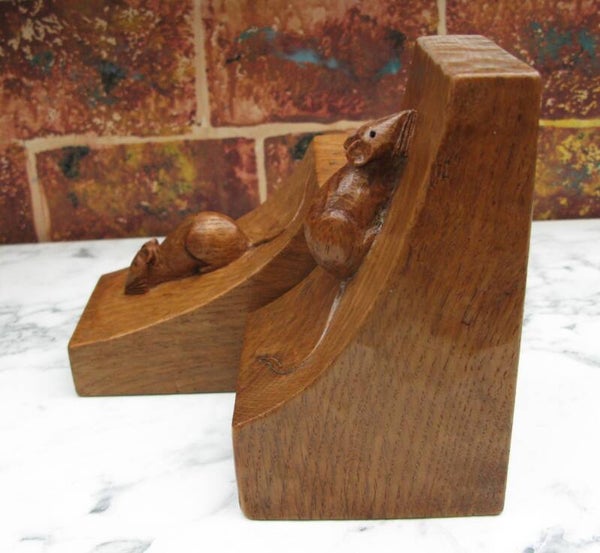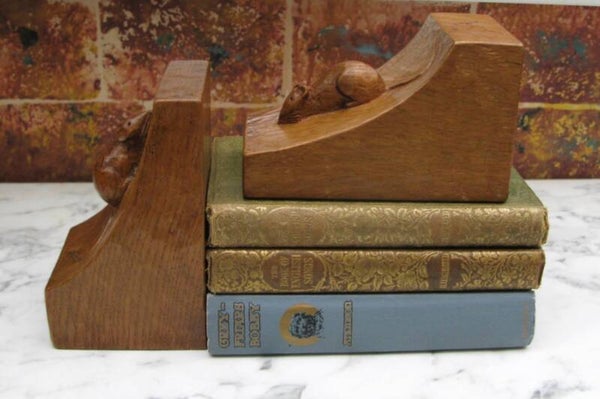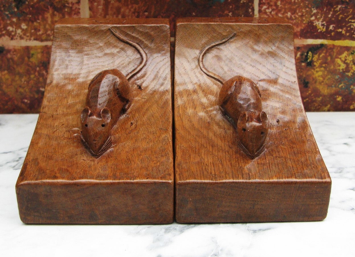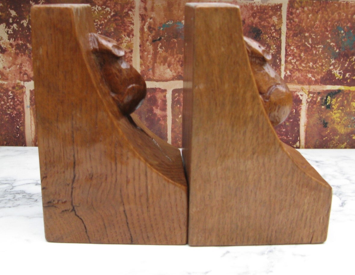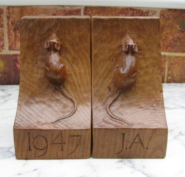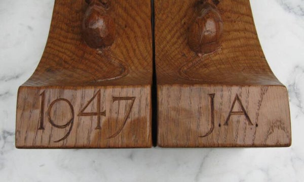 Here we have for sale a rare and early pair of fully adzed Robert "Mouseman" Thompson bookends, one bearing the date 1947, the other inscribed with the owner's initials "JA." Both sport the signature mouse in the earlier twisted scamper pose.